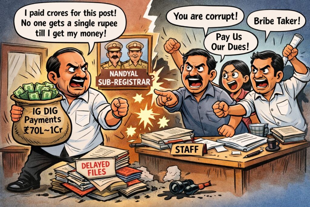 స్టాంప్స్ & రిజిస్ట్రేషన్ శాఖ ఐజీ,డీఐజీ మరియు రాజకీయ పెద్దల పేర్లు ప్రస్తావిస్తూ సంచలన ఆరోపణలు – తీవ్ర ఉద్రిక్తత సత్యం వార్త / నంద్యాల జిల్లా