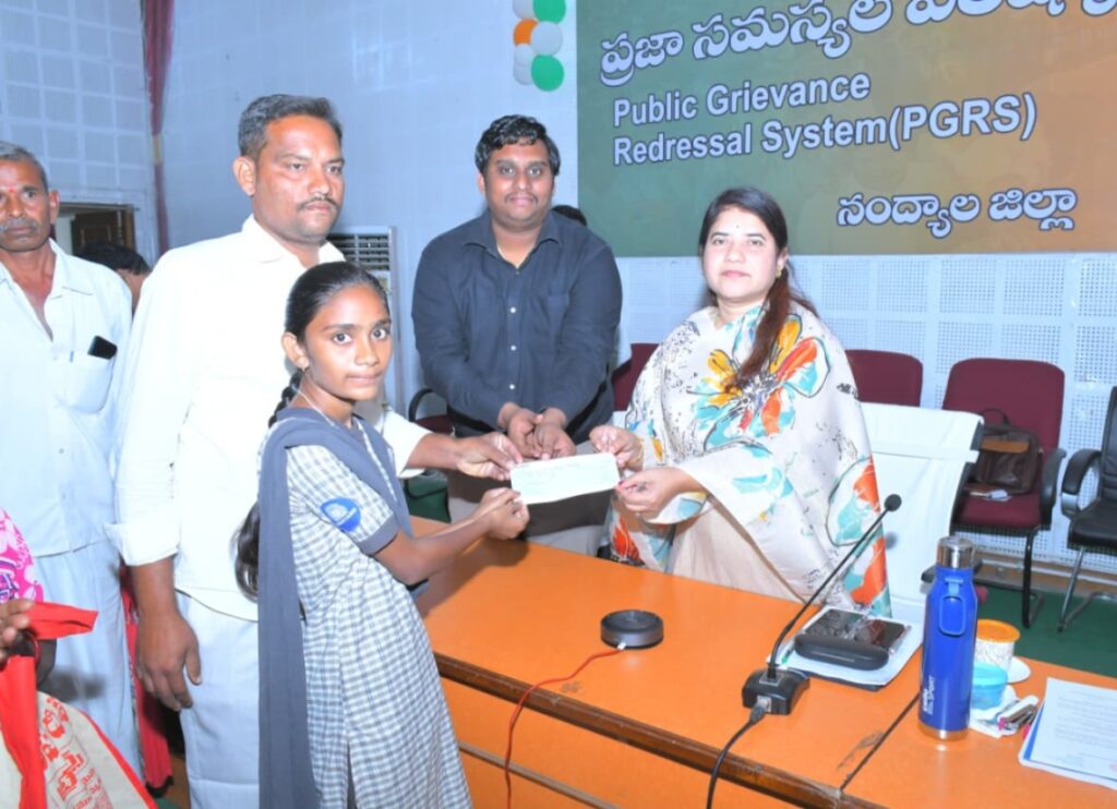 మట్టిమిద్దె కూలిపోవడం వల్ల అనాథగా మారిన విద్యార్థిని విద్యా కుసుమాన్ని అక్కున చేర్చుకొని, అమ్మాయి ఉన్నత విద్యకు అవసరమైన ఆర్థిక సహాయాన్ని జిల్లా కలెక్టర్ జి. రాజకుమారి అందజేశారు. సోమవారం కలెక్టరేట్లోని పిజిఆర్ఎస్ హాల్లో నిర్వహించిన ప్రజా సమస్యల పరిష్కార వేదికలో అర్జీల స్వీకరణ అనంతరం, మట్టిమిద్దె కూలిపోవడంతో కుటుంబాన్ని కోల్పోయిన విద్యార్థిని ఉన్నత విద్య (ఇంటర్మీడియట్) కోసం లక్ష రూపాయల విలువైన చెక్కును కలెక్టర్ చేతుల మీదుగా విద్యార్థినికి అందజేశారు.