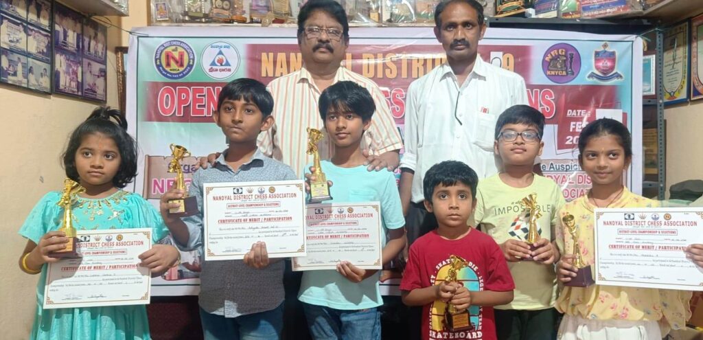 నంద్యాల జిల్లా చెస్ అసోసియేషన్ ఆధ్వర్యంలో శనివారం స్థానిక ఎన్ ఆర్ జి చెస్ అకాడమీ లో ఏడు సంవత్సరాల లోపు మరియు తొమ్మిది సంవత్సరాల లోపు క్రీడాకారులకు నిర్వహించిన జిల్లా స్థాయి ఎంపిక పోటీలలో విజేతలకు నంద్యాల జిల్లా చెస్ సంఘం అధ్యక్షులు, ఆంధ్రప్రదేశ్ చెస్ అసోసియేషన్ వైస్ చైర్మన్ డాక్టర్ జి.రవికృష్ణ, జిల్లా సంఘం ప్రధాన కార్యదర్శి రామ సుబ్బారెడ్డి విజేతలకు ట్రోఫీలు, పతకాలు, ప్రశంసా పత్రాలు ప్రదానం చేశారు. ఈ పోటీలలో విజేతలుగా నిలిచిన వారు ఈ సంవత్సరం జరగబోయే రాష్ట్రస్థాయి 7 సంవత్సరాల లోపు,9 సంవత్సరాల లోపు పోటీలలో జిల్లా జట్టు తరపున పాల్గొంటారని డాక్టర్ రవికృష్ణ, రామసుబ్బారెడ్డి తెలిపారు. చిన్న వయసులోనే చదరంగం నేర్చుకుని పోటీలలో పాల్గొనడం ద్వారా, వారి ఆసక్తిని,సాధన బట్టి త్వరిత గతిన రాష్ట్ర, జాతీయ స్థాయిలలో రాణించడానికి అవకాశం ఉంటుందని అన్నారు.