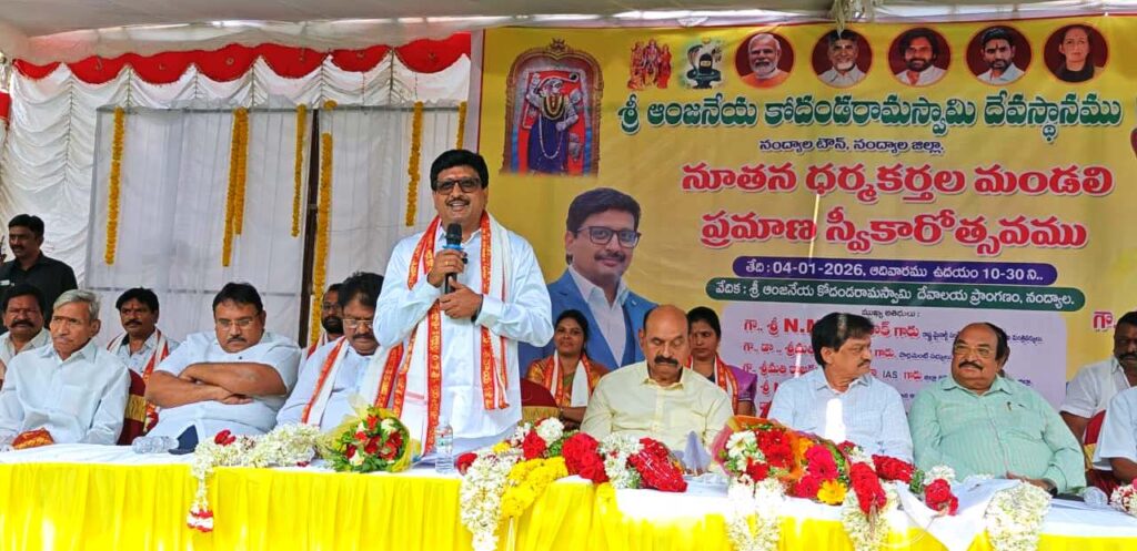 ఆదివారం నంద్యాల బస్టాండ్ సమీపంలో ఉన్న పురాతనమైన, ప్రముఖ గుడి శ్రీ ఆంజనేయ కోదండ రామస్వామి దేవస్థాన నూతన ధర్మకర్తల మండలి ప్రమాణ స్వీకారం ఘనంగా నిర్వహించారు. ఈ కార్యక్రమంలో ముఖ్యఅతిథిగా రాష్ట్ర మైనారిటీ సంక్షేమ మరియు న్యాయశాఖ మంత్రి ఎన్ఎండి ఫరూక్, గౌరవ అతిధులుగా తెలుగుదేశం పార్టీ రాష్ట్ర కార్యదర్శి వెదుర్ల రామచంద్రరావు, ఐఎంఏ రాష్ట్ర మాజీ అధ్యక్షులు, తెలుగుదేశం పార్టీ నాయకులు, శ్రీ సుంకుల పరమేశ్వరి దేవస్థానం చైర్మన్ డాక్టర్ రవి కృష్ణ, తెలుగుదేశం పార్టీ రాష్ట్ర కార్యదర్శి ఏవిఆర్ ప్రసాద్, జిల్లెల్ల శ్రీరాములు, రోటరీ జిల్లా మాజీ గవర్నర్ కందుకూరి శ్రీరామ మూర్తి పాల్గొన్నారు.