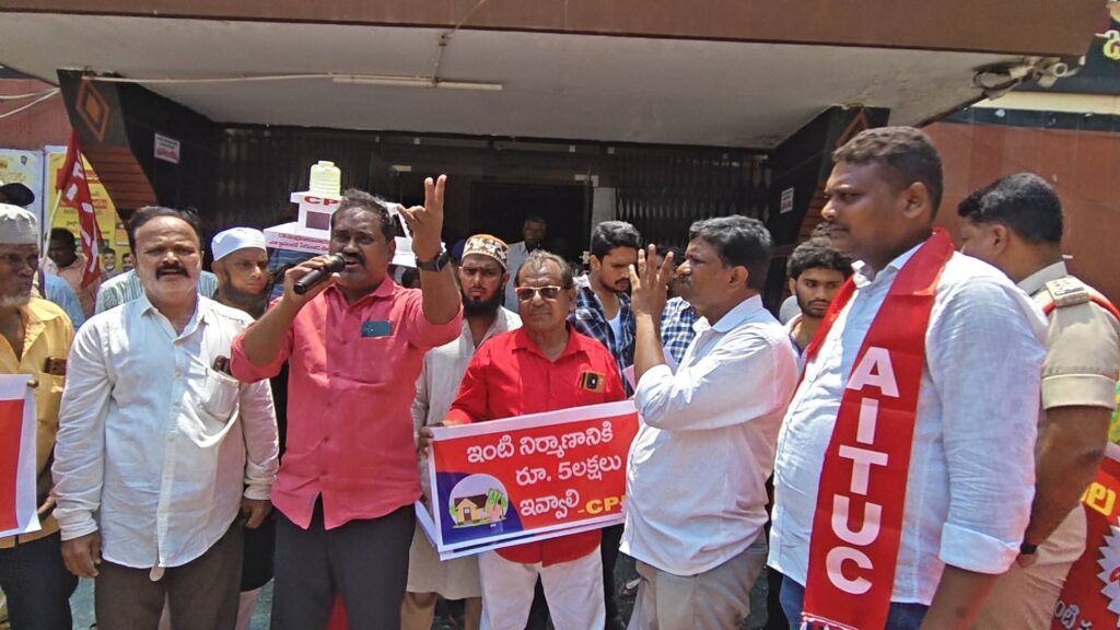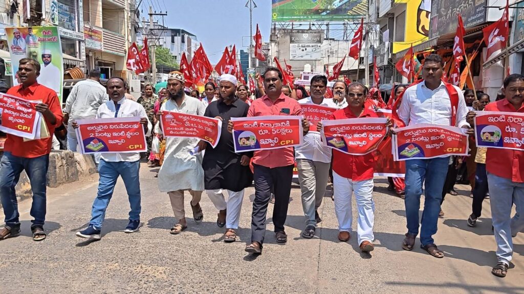 అర్హులైన నిరుపేదలకు ఇళ్ల స్థలాలు ఇవ్వాలని, ఇంటి నిర్మాణానికి ఐదు లక్షల రూపాయలు ప్రభుత్వమే చెల్లించాలని, ఇంటి స్థలాలు ఇవ్వని పక్షంలో బాడుగ ఇళ్లలో ఉన్నటువంటి పేద ప్రజలకు ఇళ్ల స్థలాలు ఇచ్చే వరకు అద్దెను ప్రభుత్వమే చెల్లించాలని డిమాండ్ చేస్తూ సిపిఐ రాష్ట్ర సమితి పిలుపులో భాగంగా నంద్యాల పట్టణంలోని టౌన్ హాల్ నుండి మంత్రి ఫరూక్ క్యాంప్ కార్యాలయం వరకు ర్యాలీ నిర్వహించి అర్హులైన పేద ప్రజలతో మంత్రి ఫరూక్ క్యాంపు కార్యాలయం ఎదుట శాంతియుతంగా నిరసన కార్యక్రమం నిర్వహించడం జరిగిందని సిపిఐ నంద్యాల జిల్లా కార్యదర్శి రంగనాయక తెలిపారు.