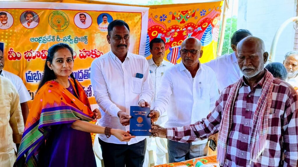 గత ఐదేళ్ల జగన్ ప్రభుత్వంలో భూముల రీసర్వే పేరుతో రెవెన్యూ వ్యవస్థను భ్రష్టుపట్టించారని ఆమె విమర్శించారు. ప్రజాధనాన్ని దుర్వినియోగం చేస్తూ భూముల హద్దురాళ్లపై కూడా జగన్ ఫోటోలు ముద్రించి తన పైశాచిక ఆనందం పొందారని విమర్శించారు. రాష్ట్రంలో రీ సర్వే పూర్తయిన గ్రామాల్లో రైతులకు కొత్త పట్టాదారు పాస్ పుస్తకాలను పంపిణీ చేస్తున్నామన్నారు. నంద్యాల జిల్లాలో 51,017 రాజముద్రణతో కూడిన పట్టాదారు పాసు పుస్తకాలను ప్రభుత్వం పంపిణీ చేస్తుందని ఎంపీ డాక్టర్ బైరెడ్డి శబరి వివరించారు. కొత్త పాస్ పుస్తకాలు ప్రభుత్వ రాజముద్రణతో పాటు క్యూ ఆర్ కోడ్ తో భారత దేశంలో ఎక్కడా లేని విధంగా ఆధునిక సాంకేతికతతో చంద్రబాబు ప్రభుత్వం ముద్రించడం జరిగిందన్నారు. రైతులు క్యూ ఆర్ కోడ్ స్కాన్ చేస్తే భూమికి సంబంధించిన పూర్తి వివరాలు కనిపిస్తాయని, ఏవైనా తప్పులు ఉంటే వెంటనే అధికారులకు తెలియజేస్తే ఉచితంగా సరిదిద్దుతూ కొత్త పాస్ పుస్తకాలు జారీ చేయడం జరుగుతుందని ఎంపీ డాక్టర్ బైరెడ్డి శబరి అన్నారు. ఈ కార్యక్రమంలో మిడ్తూరు తహసీల్దార్ టీ. శ్రీనివాసులు, వి ఆర్ ఓప్రసాదరావు, డిప్యూటీ ఎంపీడీఓ సురేష్, టీడీపీ సీనియర్ నాయకులు చెరుకుచెర్ల రఘురామయ్య, తిమ్మాపురం టీడీపీ నాయకులు శ్రీనివాస రెడ్డి, మాజీ జడ్పీటీసీ నాగేశ్వరావు, మిడ్తూరు భగీరథ రెడ్డి, జలకనూరు స్వామిరెడ్డి, శేషిరెడ్డి, కొనేటమ్మ పల్లె రఘురామిరెడ్డి, తదితరులు పాల్గొన్నారు.