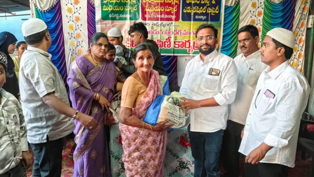 నబి నగర్ లోని రాయల్ పబ్లిక్ స్కూల్ నందు ఘనంగా ఈద్ కిట్ల పంపిణీ నంద్యాల పట్టణం నడిగడ్డ లోని రాయల్ ఇంగ్లీష్ మీడియం పాఠశాలలో రాయల్ ఇంగ్లీష్ మీడియం స్కూల్ అధ్యక్షులు వి ఖాజా హుస్సేన్ మరియు పాఠశాల డైరెక్టర్ డాక్టర్ యాకుబ్ కరస్పాండెంట్ ఇషాక్ వలి ఆధ్వర్యంలో ఈద్ కిట్ల పంపిణీ చేయడం జరిగింది. ఈ కార్యక్రమంలో ముఖ్య అతిథులుగా జమాతుల్ ఉలుమా వల్ అయిమ్మ ఫౌండేషన్ ట్రస్ట్ అధ్యక్షులు అబ్దుల్ హాది హాజరత్ మరియు నవభారత్ పాఠశాల కరస్పాండెంట్ ఎస్ఎండి హుస్సేన్ పాల్గొనడం జరిగింది పాఠశాల డైరెక్టర్ యాకూబ్ మాట్లాడుతూ సమాజంలో ఆర్థికంగా మెరుగుపడినటువంటి వారందరూ వారు సంపాదనలో 2.5%జకాత్ రూపంలో తీసి నిరుపేదలకు తోడ్పాటు అందించుట అల్లా యొక్క ఆదేశం మేరకు మేము కూడా రాయల్ ఇంగ్లీష్ మీడియం స్కూల్ తరఫునుంచి దాదాపుగా 14 ఏళ్ల నుంచి రంజాన్ తోఫా అందించే కార్యక్రమాన్ని నిర్వహిస్తున్నాం. రాయల్ ఇంగ్లీష్ మీడియం స్కూల్ లో 50 మంది తో మొదలుపెట్టి దాదాపు 500 మంది పేదలకు నిరుపేదలకి మరియు అవసరార్థులకు రంజాన్ పండుగ సంతోషంగా జరుపుకోవాలని రంజాన్ తోఫ ఇవ్వడం జరుగుతుంది ఈ రంజాన్ తోఫాలో దాదాపుగా 13 రకాల వస్తువులను ఇవ్వడం జరిగింది ఈ కార్యక్రమంలో ముఖ్యఅతిథి అయినటువంటి హజ్రత్ అబ్దుల్ హాది మాట్లాడుతూ డాక్టర్ యాకుబ్ మరియు ఇషాక్ వలి దాదాపుగా 16 సంవత్సరాల నుండి ఈ యొక్క రంజాన్ తోఫా పేద ప్రజలకు ఇచ్చి వారు కూడా అందరితో సమానంగా రంజాన్ పండుగ చేసుకోవాలని ఉద్దేశంతో ఈ కిట్లని ఇవ్వడం జరుగుతుందని చెప్పడం జరిగింది నవ భారత్ పాఠశాల కరస్పాండెంట్ ఎస్ఎండి హుస్సేన్ మాట్లాడుతూ ప్రతి ఒక్కరూ తమ ఆదాయంలో నుంచి రెండున్నర పర్సెంట్ జకాత్ రూపంలో తీసి పేద ప్రజలకు పంచినట్లయితే వారు కూడా సంతోషంగా ఈ యొక్క ఈ రంజాన్ పండుగ నిర్వహించుకుంటారని ఈ విధంగా చేయడం ద్వారా అల్లా యొక్క కృపా వల్ల మనం ఇతరులకు ఉపయోగపడినట్టు అవుతుందని చెప్పడం జరిగింది ఈ కార్యక్రమంలో తాహేరా హెల్త్ అండ్ ఎడ్యుకేషనల్ సొసైటీ మెంబర్ వి యూసుఫ్ షరీఫ్ మౌలానా సాయి వాణి స్కూల్ కరస్పాండెంట్ హుస్సేన్ బాషా మరియు రాయల్ పబ్లిక్ స్కూల్ ఉపాధ్యాయులు పాల్గొన్నారు జరిగింది.