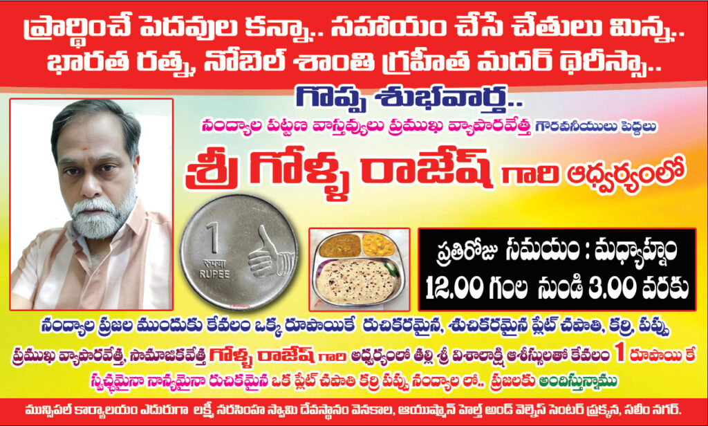 సత్యం వార్త / నంద్యాల జిల్లా ప్రతినిధి / జనవరి 12 :సంక్రాంతి సందర్భంగా కేవలం ఒక్క రూపాయికే జొన్న రొట్టె,పప్పు.. ప్రారంభించారు ప్రముఖ వ్యాపారవేత్త సామాజిక
