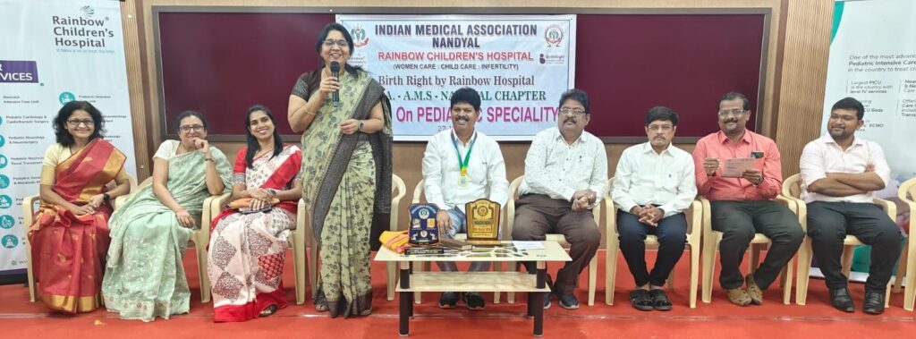 నంద్యాల ఐఎంఏ ఆధ్వర్యంలో నిర్వహించిన హైదరాబాద్ రెయిన్ బో చిల్డ్రన్ హాస్పిటల్ సదస్సులో ప్రసంగించిన మహిళా వైద్యులు న్యూరో సర్జన్ డాక్టర్ విశాఖ, న్యూరాలజిస్ట్ డాక్టర్ రమ్య,